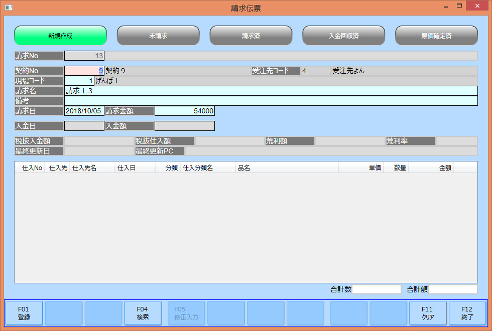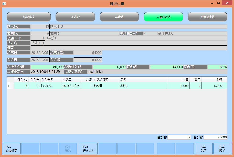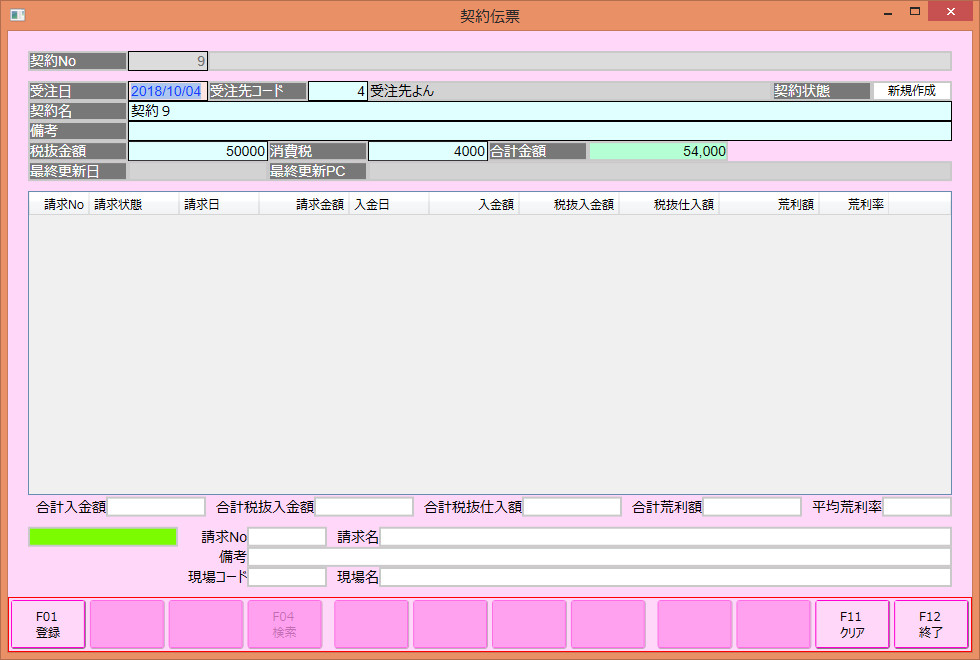 契約して仕事を受注から、その契約に関する請求、原価を管理するシステムです。 |