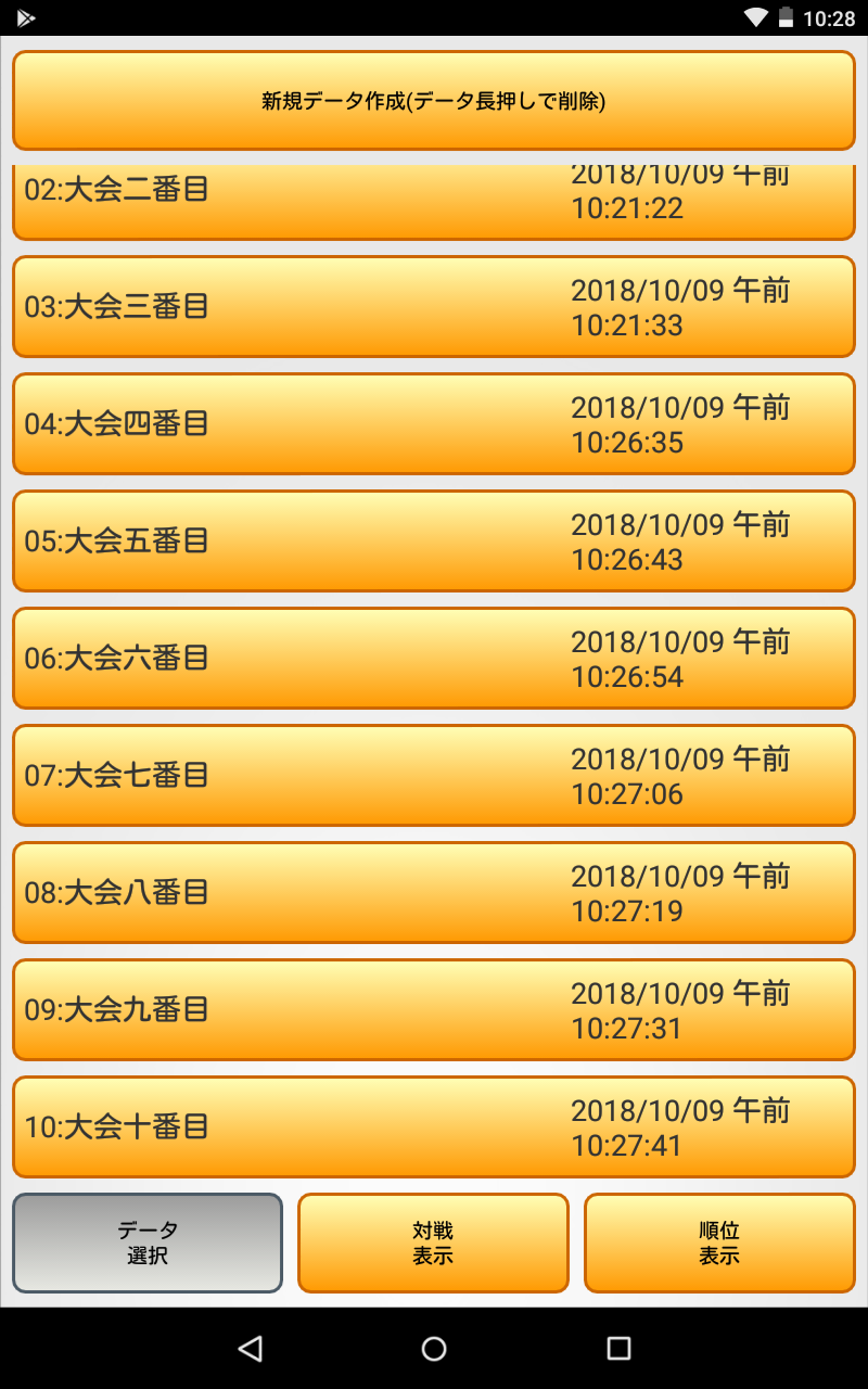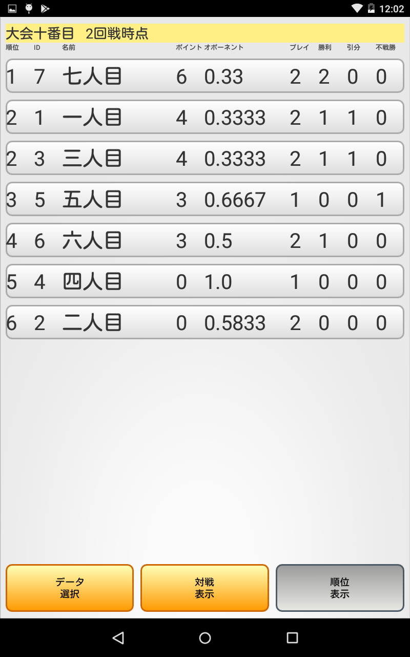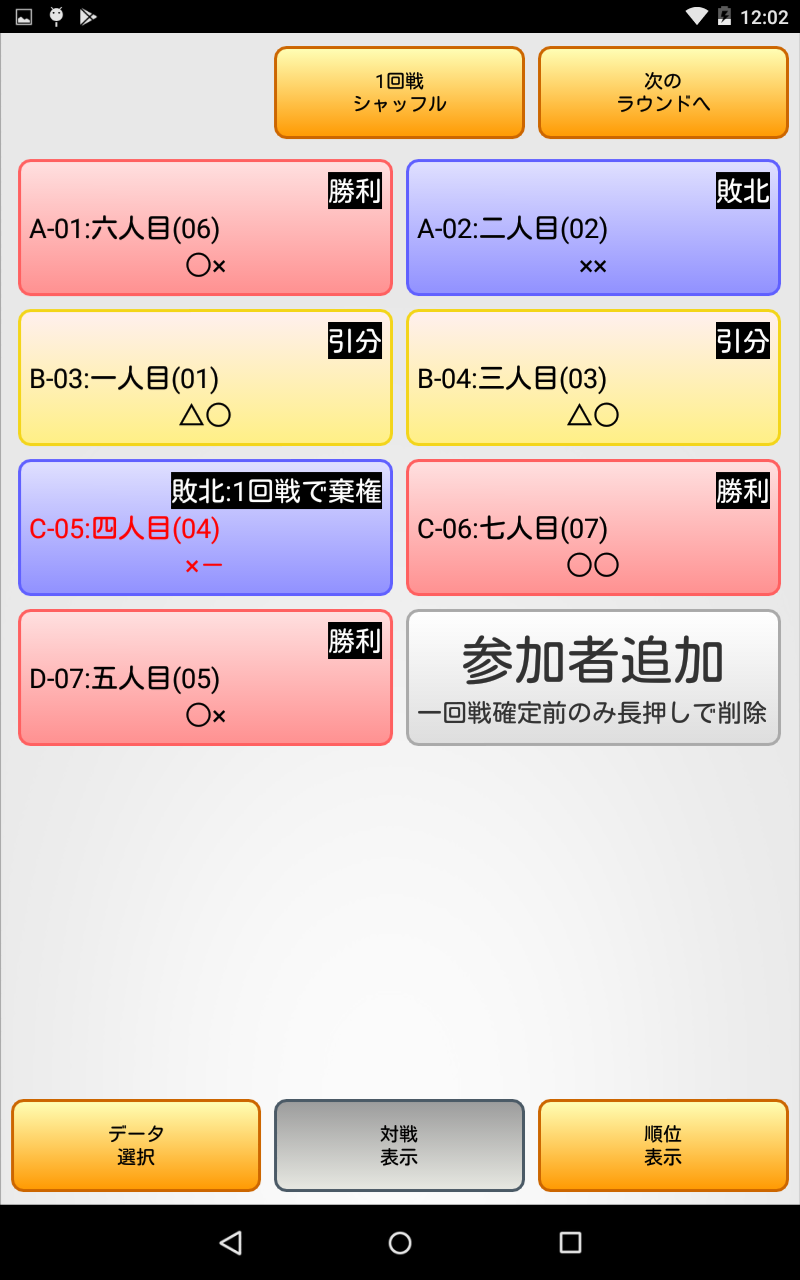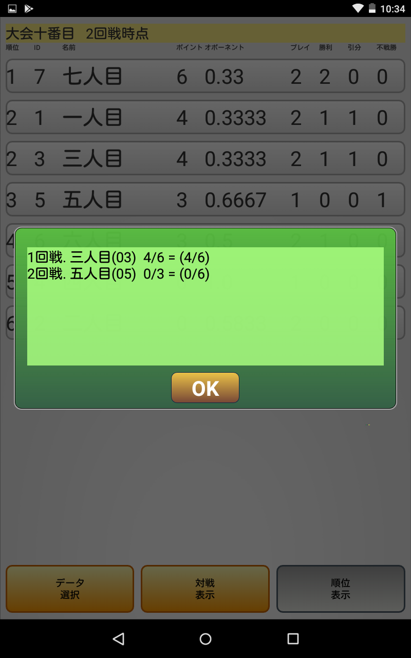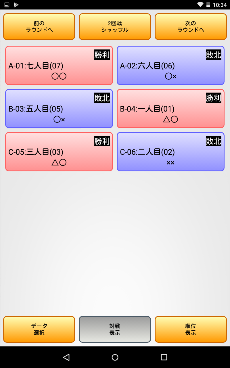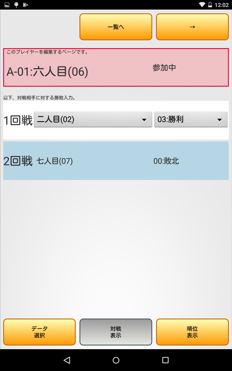 選手のボタンをタップすると勝敗入力画面になります。 |